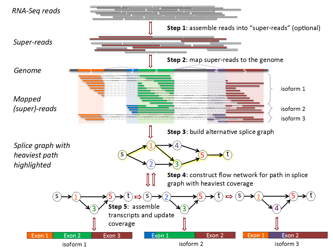 After we have aligned our reads to the reference genome, Stringtie will build the “alternative splice graph”, then proceed on to constructing the “flow network”. Finally, it will identify the most likely transcripts using a network flow algorithm. Note that this algorithm focusses on the most commonly seen splicing patterns, and uses these to guide the assembly.